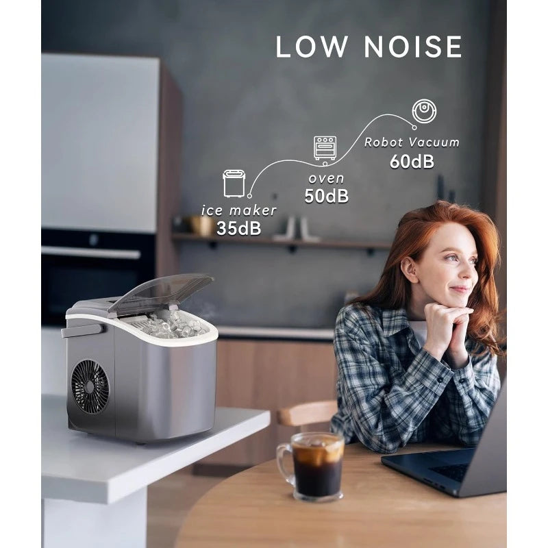 Craft ice on demand with this efficient countertop ice maker that produces 9 cubes in just 6 minutes. Featuring automatic self-cleaning technology, it eliminates maintenance hassles and ensures hygienic ice production every time. The compact design fits seamlessly on any counter, while the included handle, ice bags, scoop, and basket make storage and serving effortless. Perfect for entertaining, offices, or everyday refreshment—enjoy fresh ice whenever you need it without the wait.